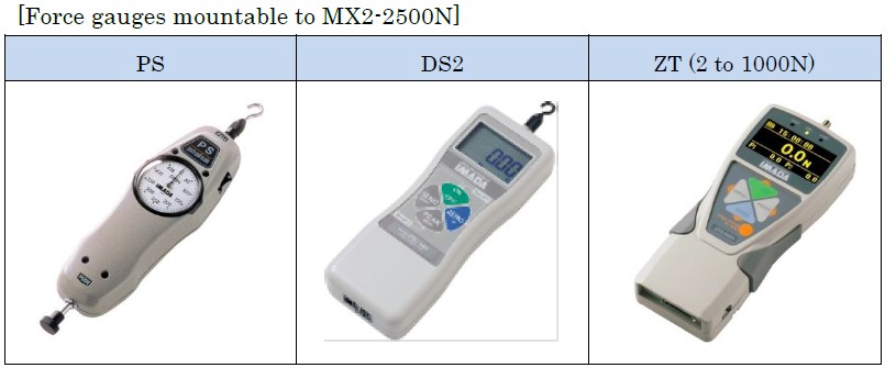 | Gauges that can be combined (*1) | Force gauges and DPU series load cells (up to 500N)except High capacity model | Force gauges, DPU series load cells (*2) | Force gauges, DPU series load cells(up to 500N) (*2) |