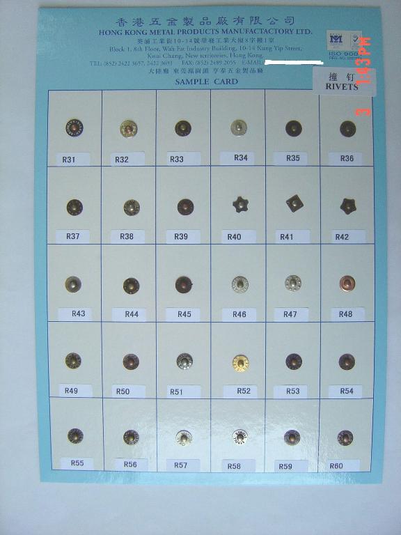 Contact Details : 香港五金製品廠有限公司 Hong Kong Metal Products Mfy. Ltd . . . . .東莞市駿雅鈕扣有限公司 Dong Guan Junya Matel Button Co., Ltd.