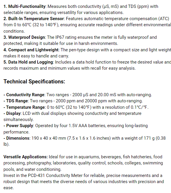 PCD-431電導率儀兼具精度、多功能性和耐用性,是各行各業應用中不可或缺的工具。