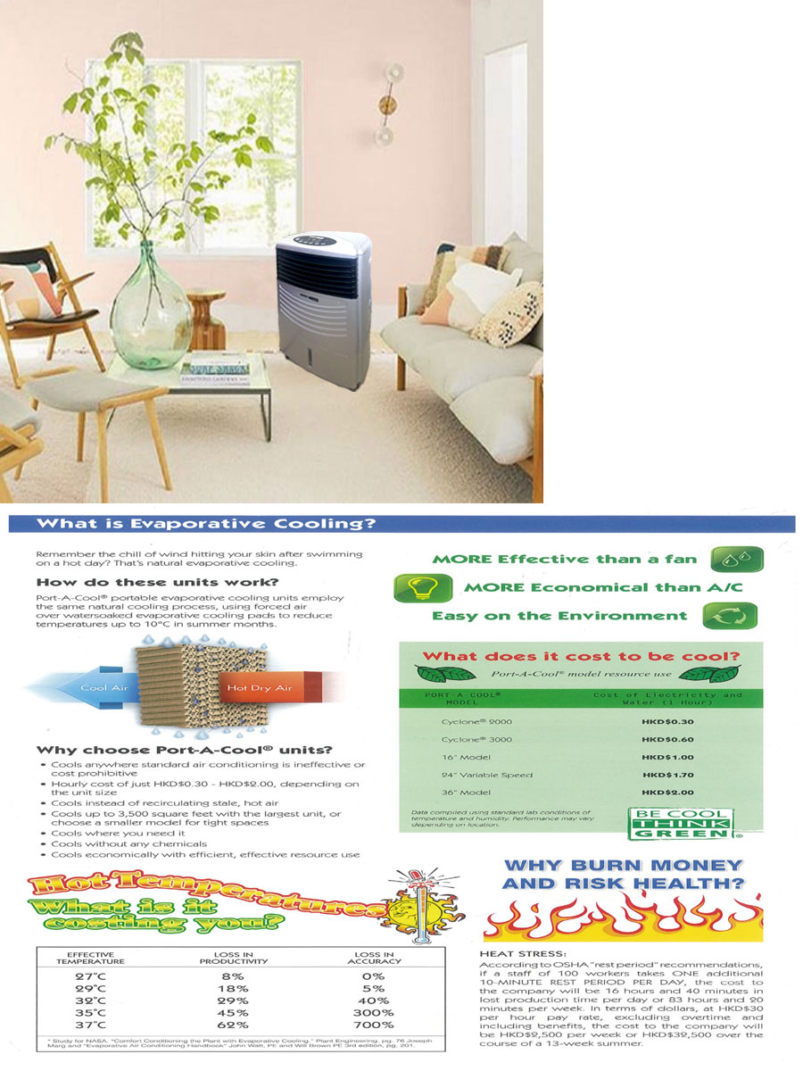 隨著氣候變化,香港炎熱的日子愈來愈多,長時間處於高溫天氣下,容易中暑或熱衰竭,危害健康。傳統空調耗電量大,在酷熱天氣警告下,某些空氣不太流通的地方,如貨倉、地下停車場等,更為悶熱難耐,所使用的冷凍劑又會嚴重破壞環境,亦難以應用於戶外場所。因此,好環境工程服務有限公司從美國引入Port-A-Cool®系列冷風機,此冷風機主要是透過蒸發,利用水流吸收空氣中的熱能,輸送出涼風,令周遭溫度下降,省電又環保。