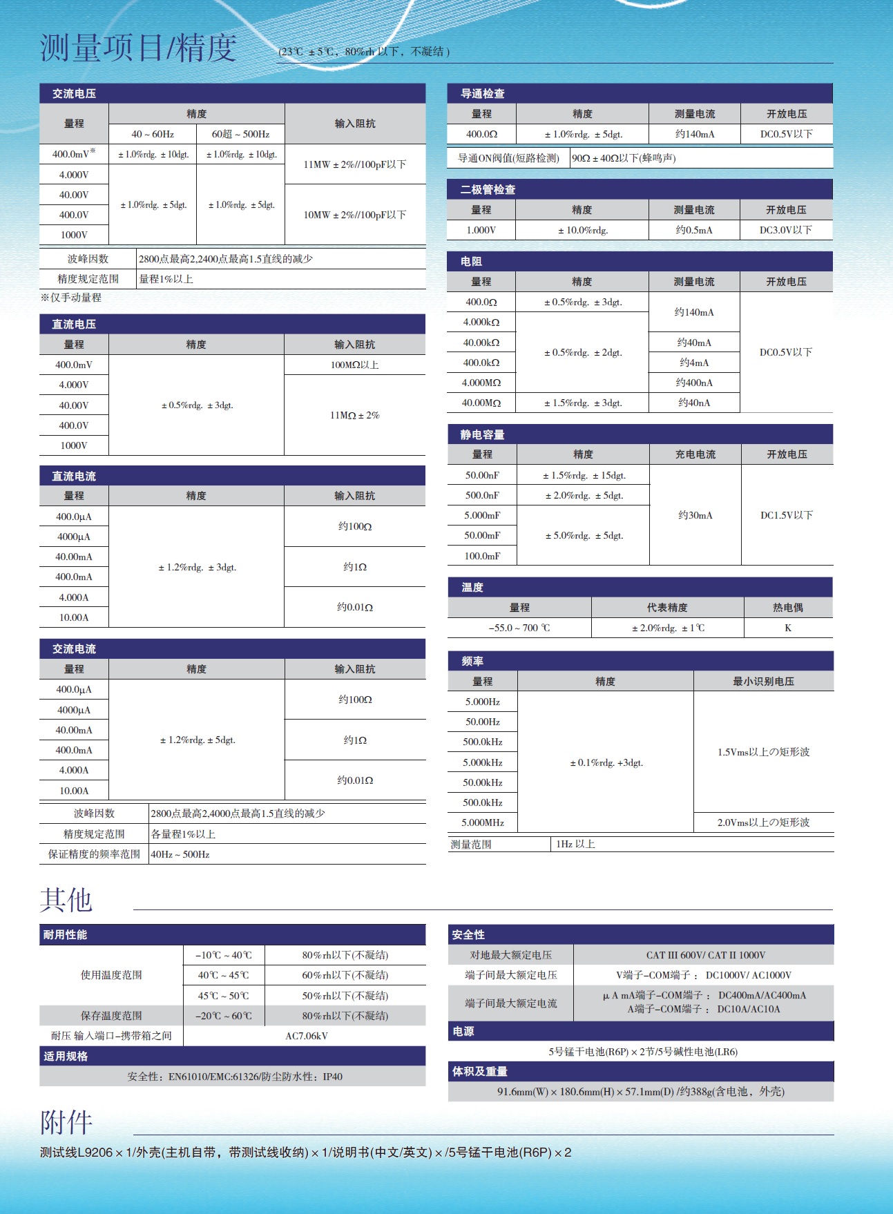 DC V基本精度±0.5%,AC V的频率特性40~1kHz的标准型